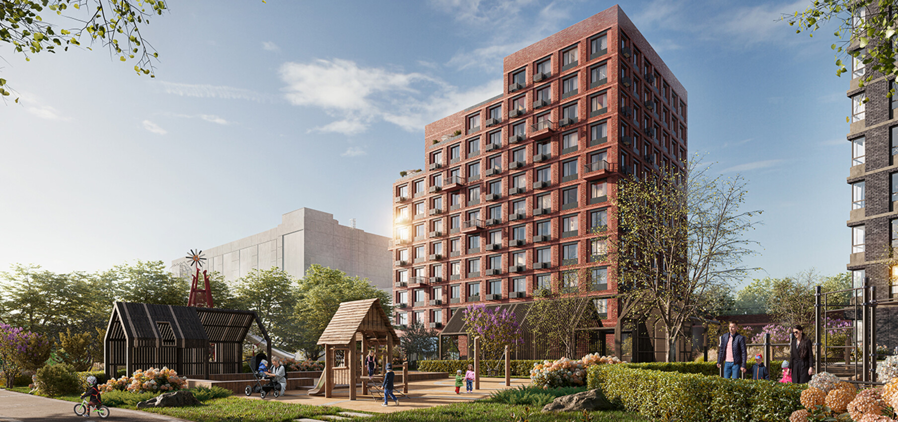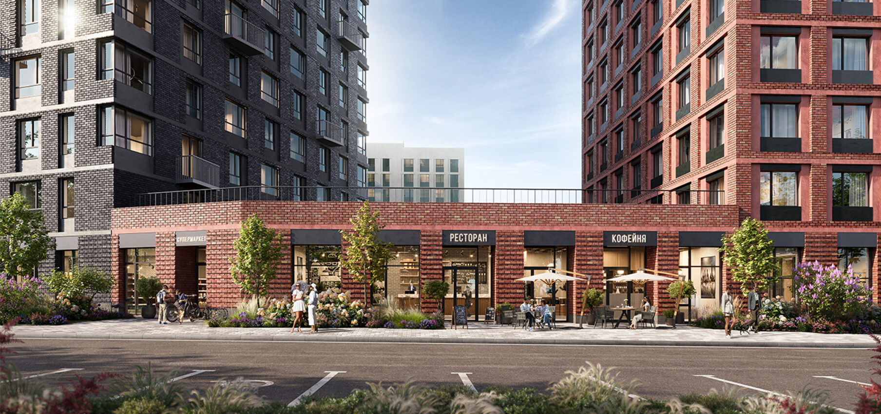 Архитектурная концепция первого дома проекта представляет собой замкнутый квартал из семи секций с акцентной башней-доминантой. Фасады оформлены ригельным кирпичом и мокрой штукатуркой светлого оттенка, благодаря природным оттенкам и переменной этажности двор всегда будет наполнен светом.
