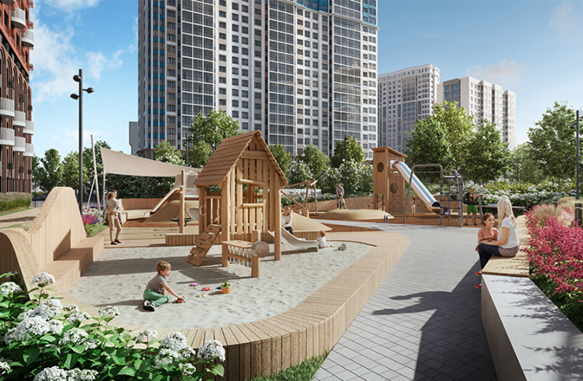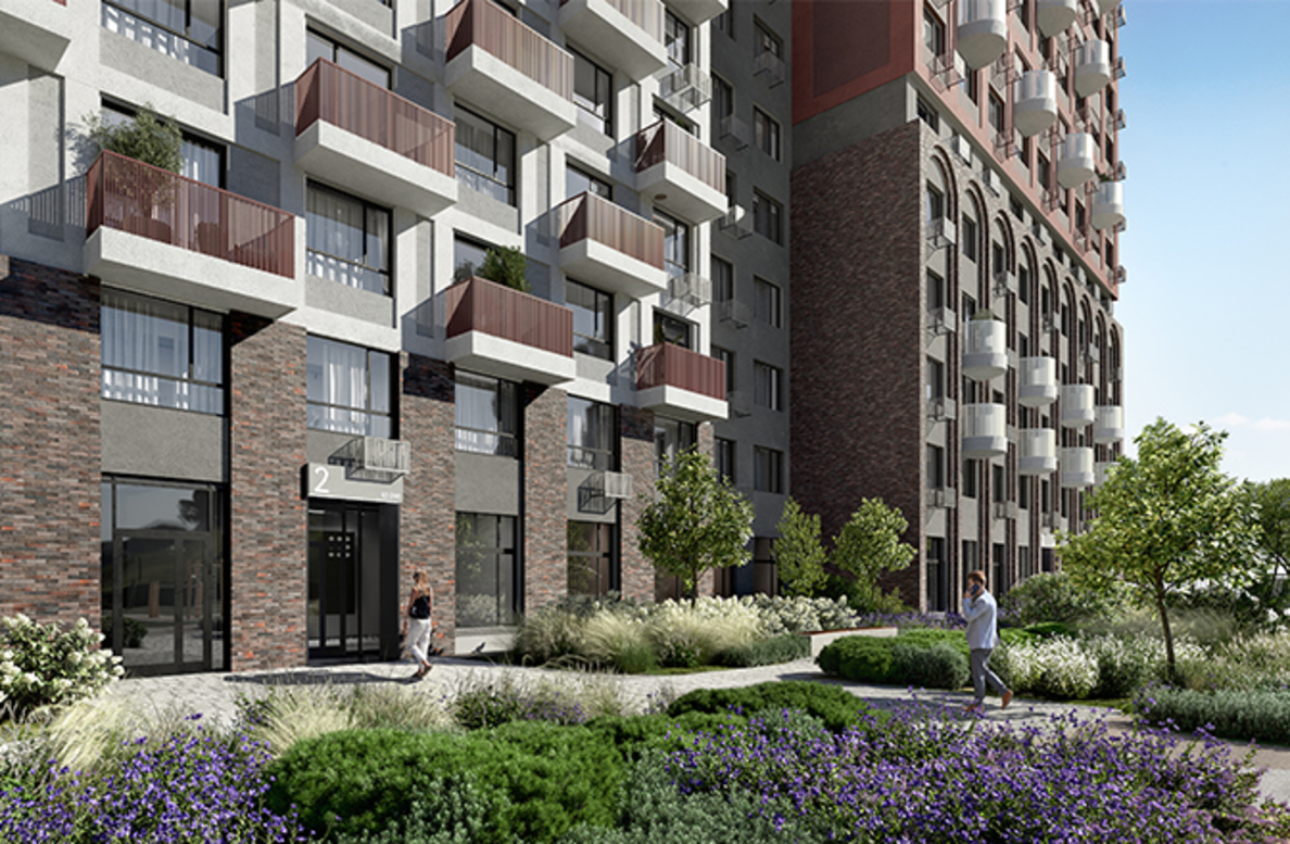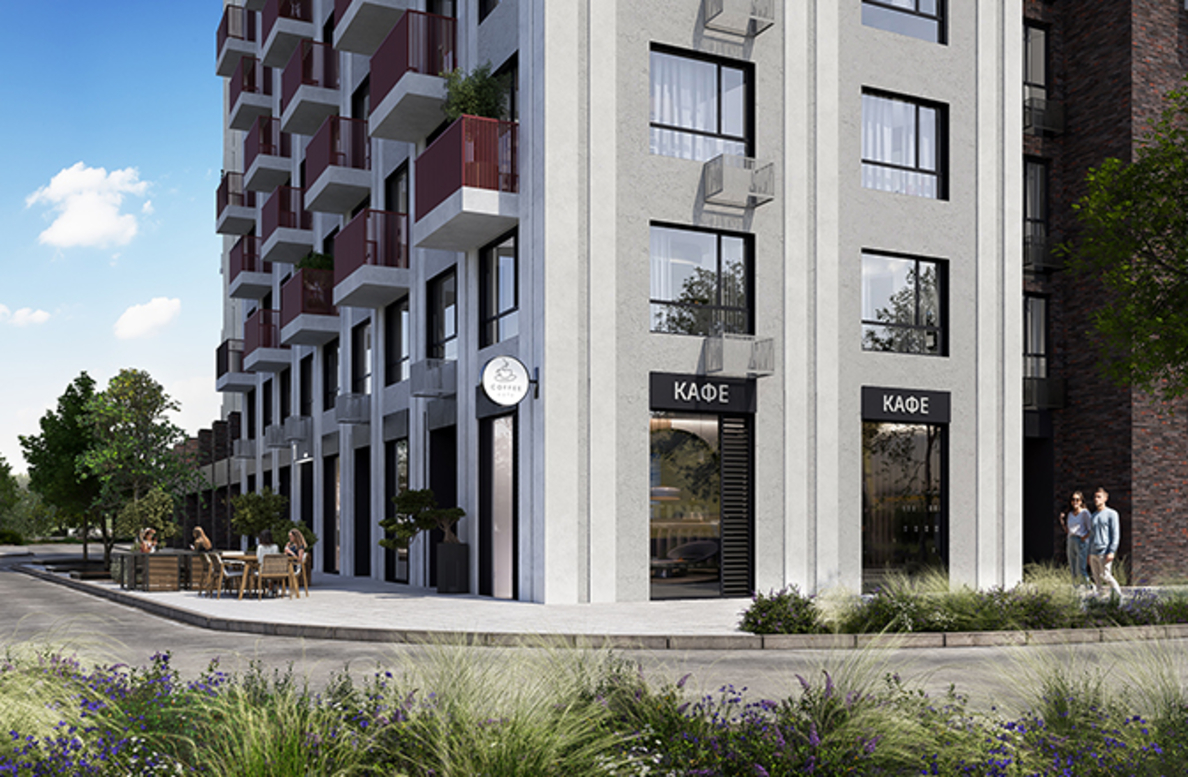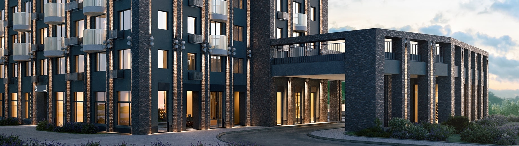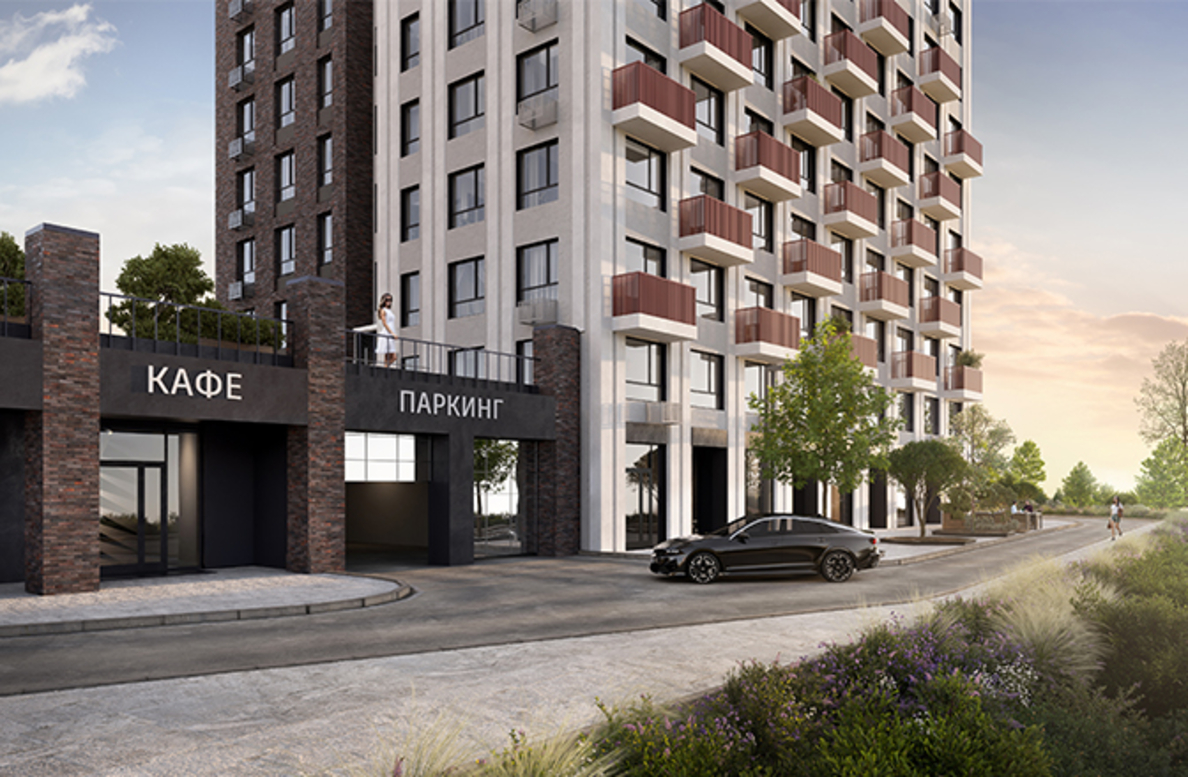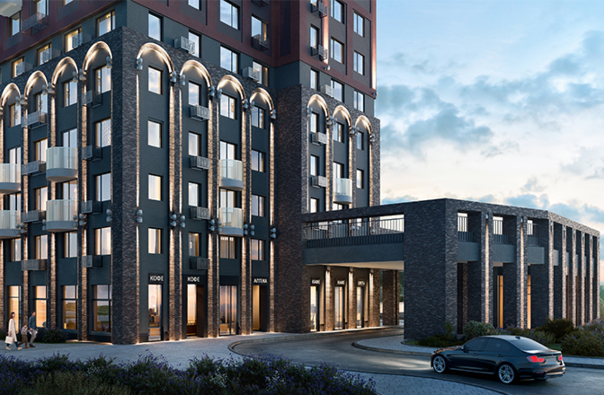 В архитектурной концепции проекта воплощено взаимодействие природы и цивилизации. Облицовка из кирпича в сочетании с окнами и полукруглыми балконами создают динамичный образ, созвучный потоку речных волн. А натуральные цвета фасадов и акцентные терракотовые вставки напоминают ландшафт песочного берега. Основная идея — создать индивидуальную архитектуру, выделяющуюся среди окружения. Массинг из французских балконов и архитектурная подсветка придают фасадам пластику, а также акцентно выделяют квартал. Облик дома мы разнообразили панорамным остеклением и архитектурной подсветкой.