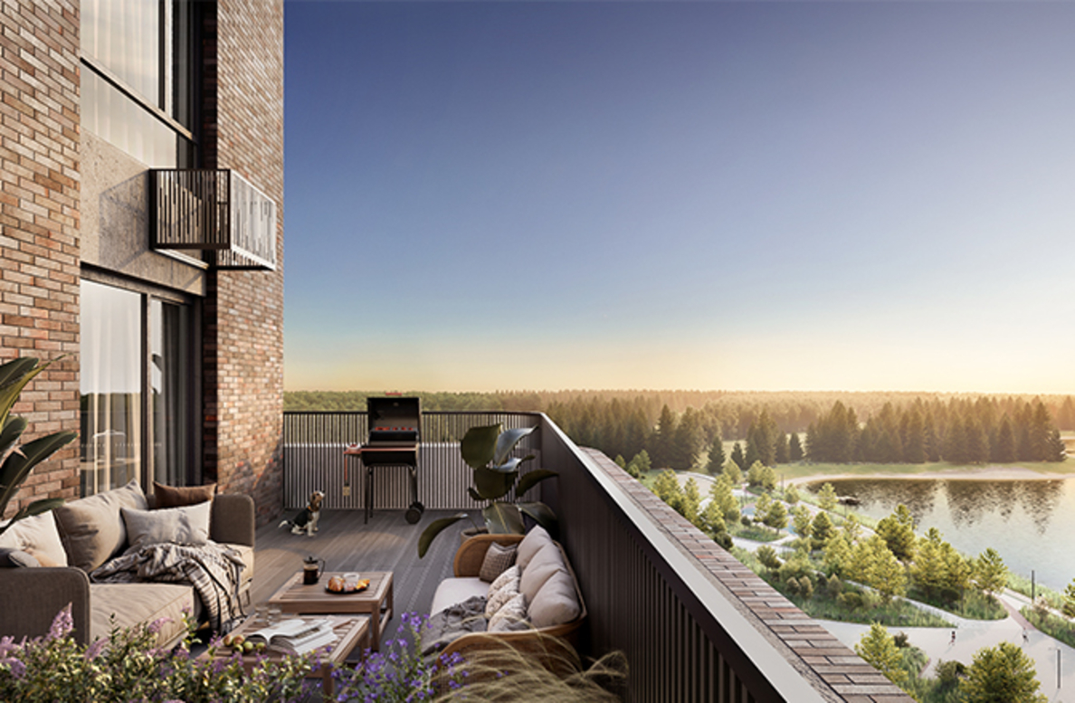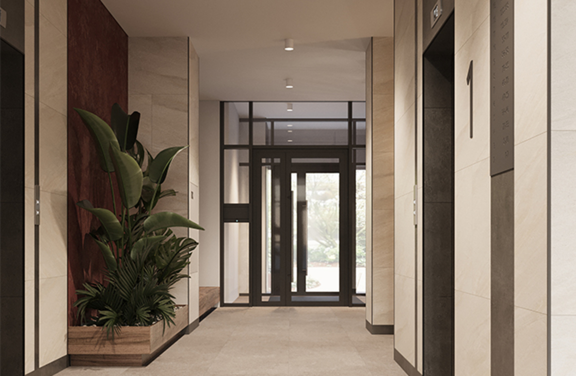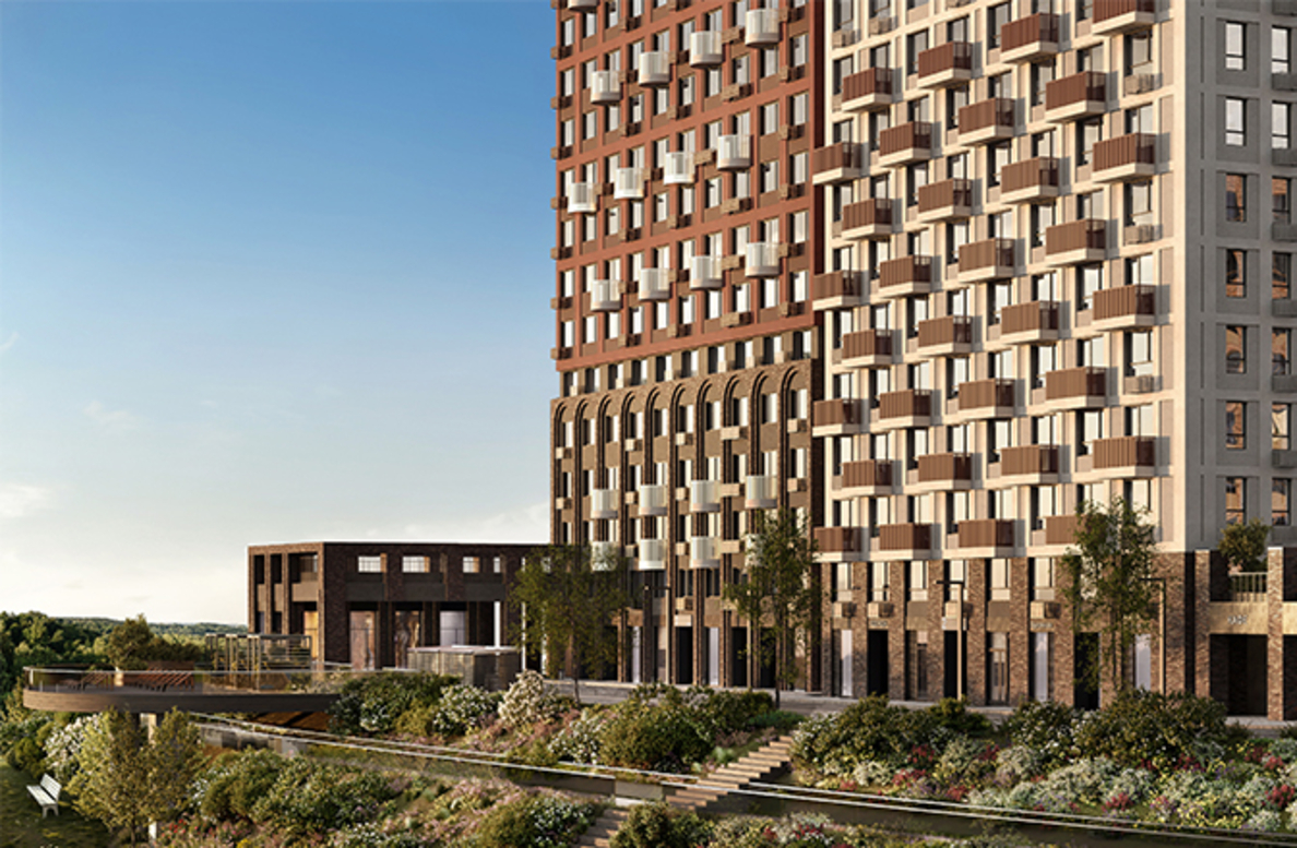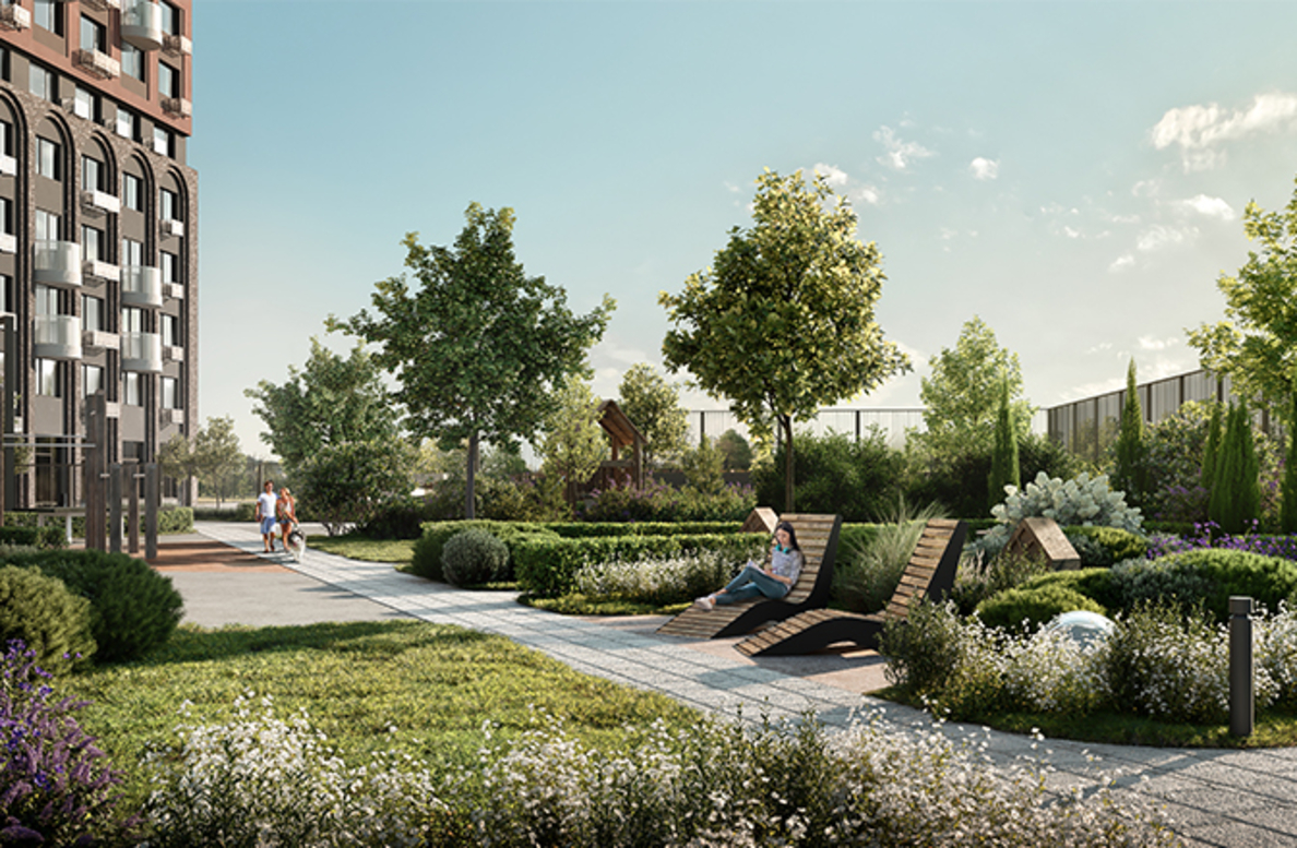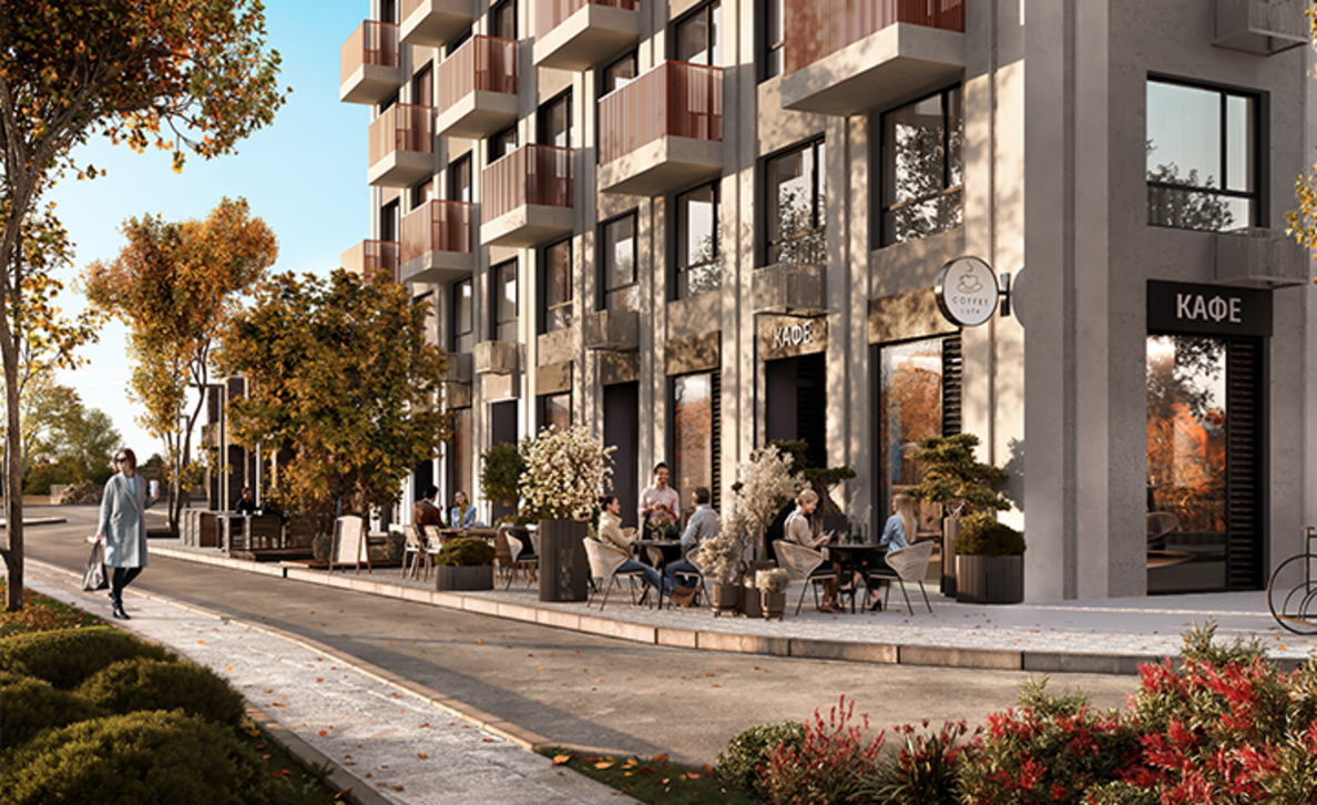 В архитектурной концепции проекта воплощено взаимодействие природы и цивилизации. Облицовка из кирпича в сочетании с окнами и полукруглыми балконами создают динамичный образ, созвучный потоку речных волн. А натуральные цвета фасадов и акцентные терракотовые вставки напоминают ландшафт песочного берега. Основная идея — создать индивидуальную архитектуру, выделяющуюся среди окружения. Массинг из французских балконов и архитектурная подсветка придают фасадам пластику, а также акцентно выделяют квартал. Облик дома мы разнообразили панорамным остеклением и архитектурной подсветкой.