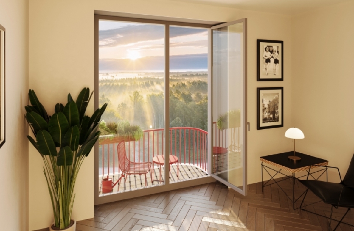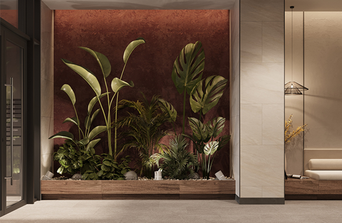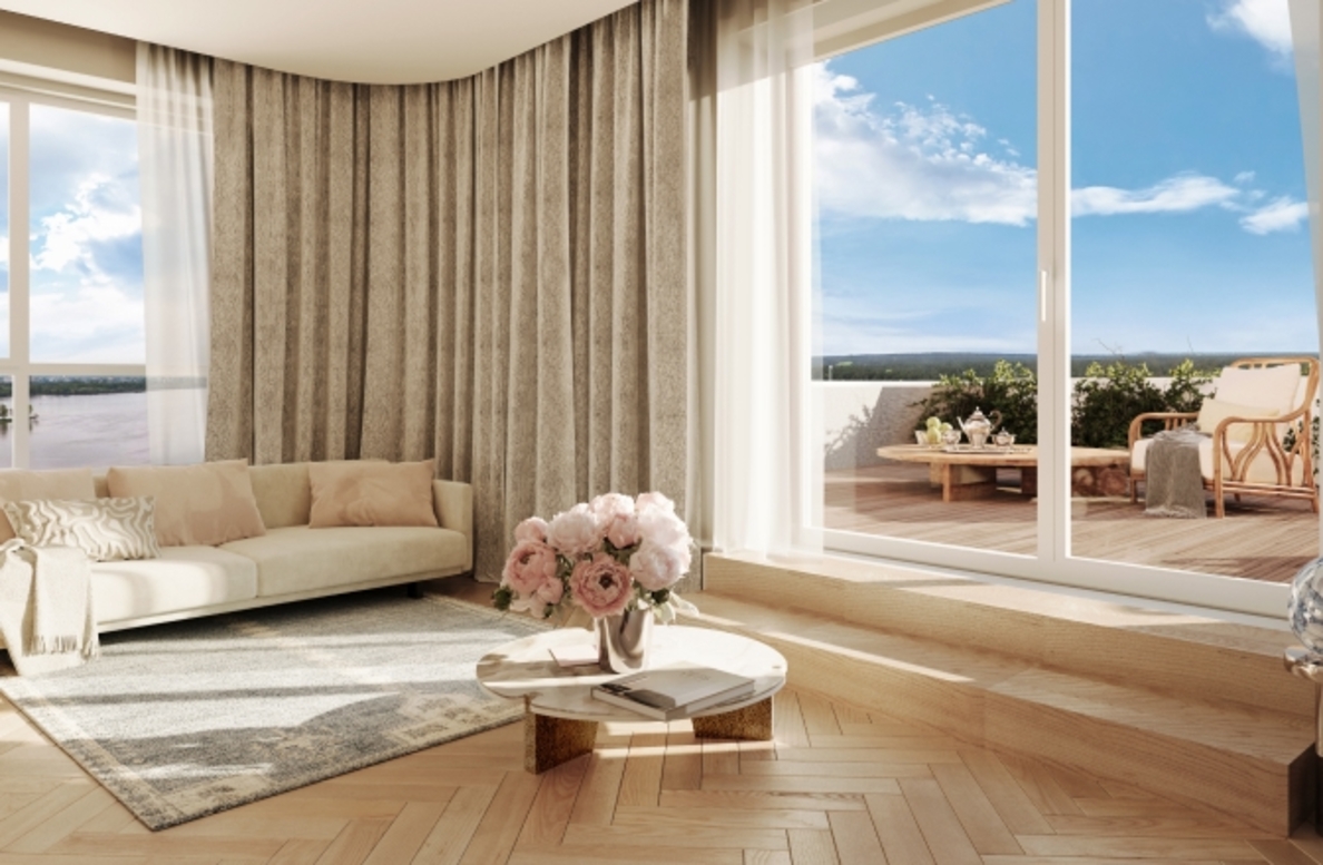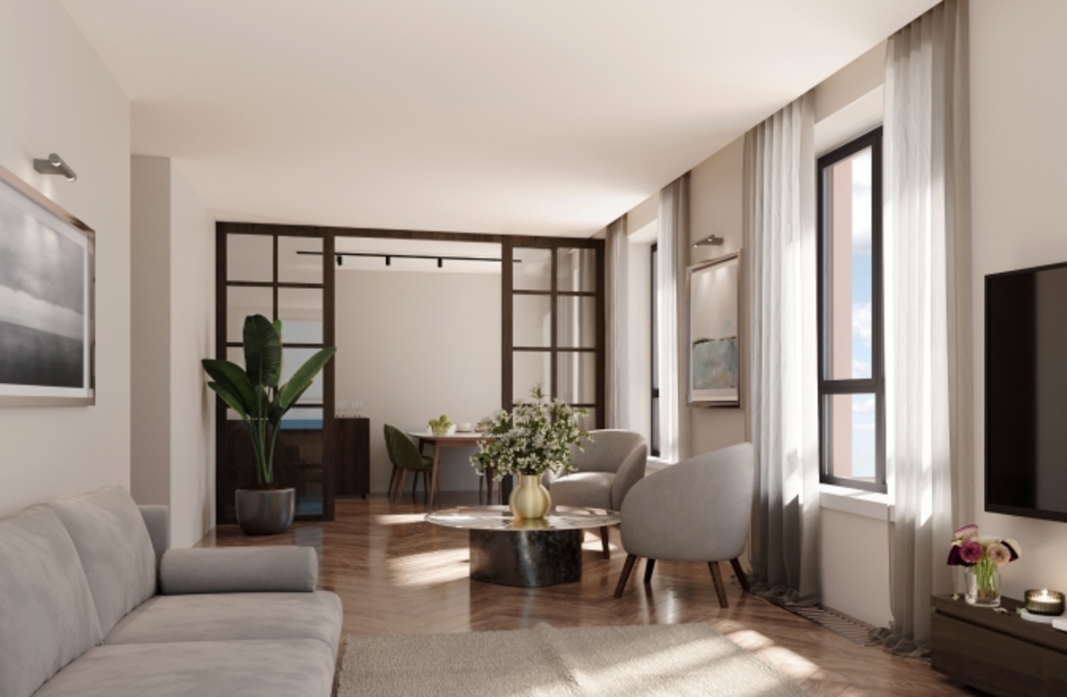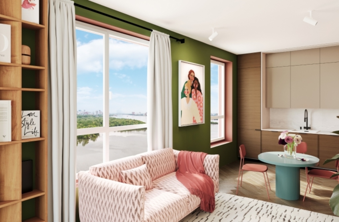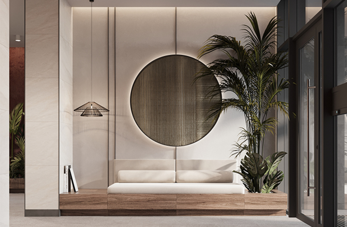 В архитектурной концепции проекта воплощено взаимодействие природы и цивилизации. Облицовка из кирпича в сочетании с окнами и полукруглыми балконами создают динамичный образ, созвучный потоку речных волн. А натуральные цвета фасадов и акцентные терракотовые вставки напоминают ландшафт песочного берега. Основная идея — создать индивидуальную архитектуру, выделяющуюся среди окружения. Массинг из французских балконов и архитектурная подсветка придают фасадам пластику, а также акцентно выделяют квартал. Облик дома мы разнообразили панорамным остеклением и архитектурной подсветкой.