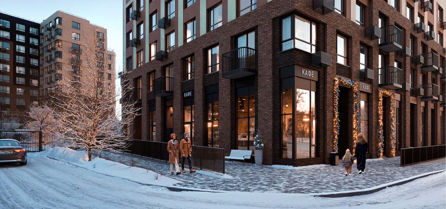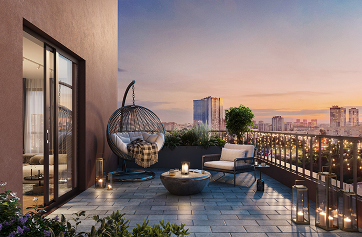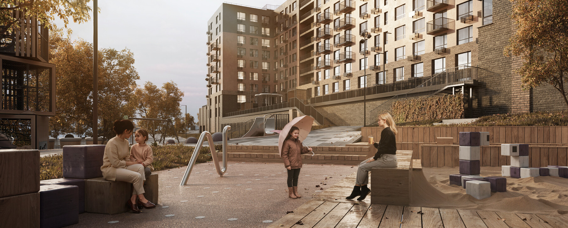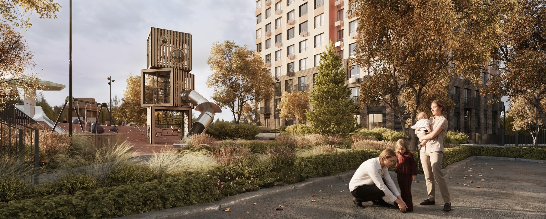 Архитектурная концепция представляет собой разомкнутый квартал с акцентной башней-доминантой. Цветовая палитра проекта представлена в бежево-терракотовых оттенках. Пластику фасадам придают сочетание чётких линий со скруглёнными формами, террасы, угловое остекление, массинг добавляют открытые балконы. Чередование фактур отделочных материалов создает визуальную ритмичность фасада, придавая ему уникальность и глубину, подчёркивая каждую грань архитектурного облика.