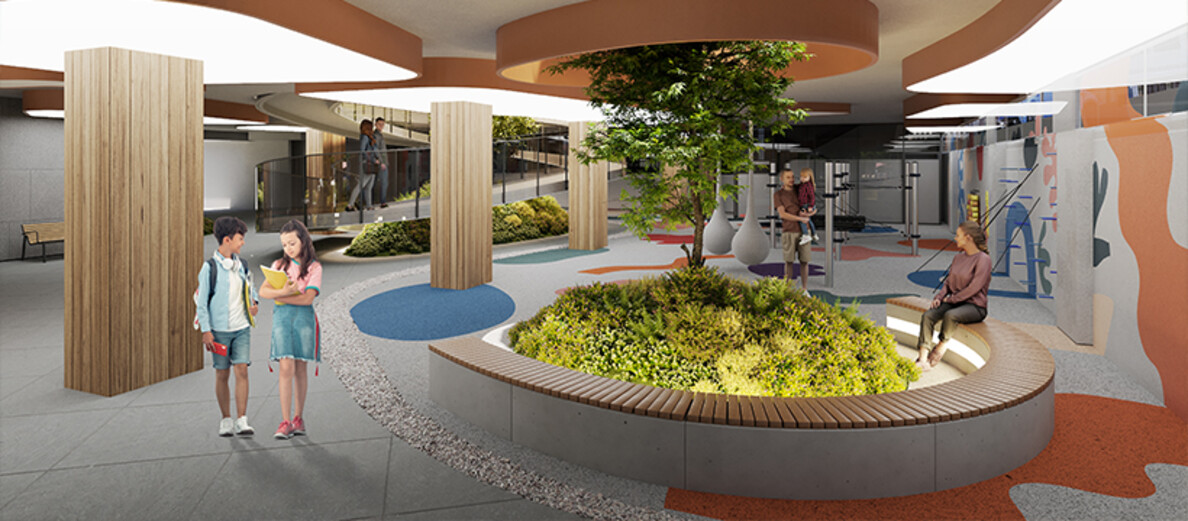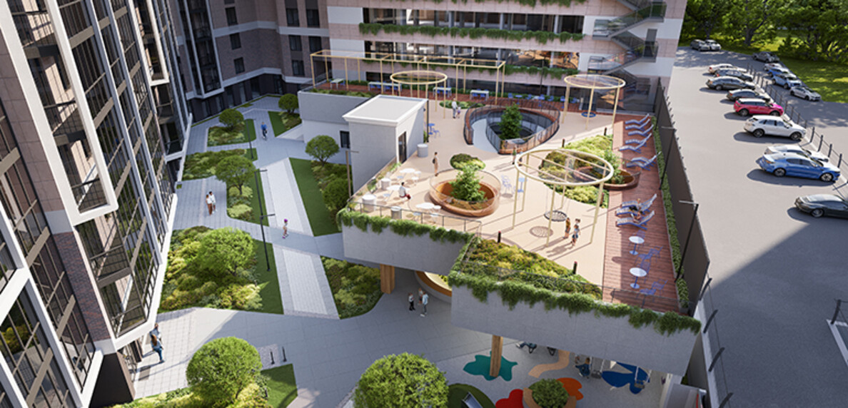 Здесь расположены разноуровневые амфитеатры, терраса с навесом и фотозона.